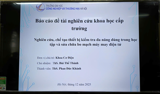 Ngày 12/12/2025, Khoa Cơ Điện – Trường Đại học Công nghiệp và Thương mại Hà Nội đã tổ chức nghiệm thu cấp khoa đề tài nghiên cứu khoa học năm học 2023–2024 do ThS. Bùi Thế Thành làm chủ nhiệm, với tên đề tài: “Nghiên cứu, chế tạo thiết bị kiểm tra đa năng dùng trong học tập và sửa chữa bo mạch máy may điện tử”. Buổi nghiệm thu được tổ chức nghiêm túc, đúng quy định, thể hiện tinh thần khoa học, trách nhiệm và sự quan tâm của Khoa đối với hoạt động nghiên cứu – ứng dụng trong giảng dạy và thực tiễn sản xuất.