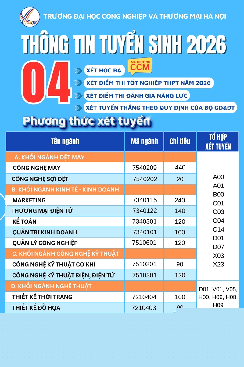 Thí sinh có thể sử dụng kết quả thi năng khiếu môn Vẽ Mỹ thuật, Bố cục màu tại trường Đại học Công nghiệp và Thương mại Hà Nội (thi tuyển vào 10/5/2026) hoặc chuyển kết quả thi năng khiếu khối V và khối H của các trường đại học khác có tổ chức thi trong năm 2026 để xét tuyển.