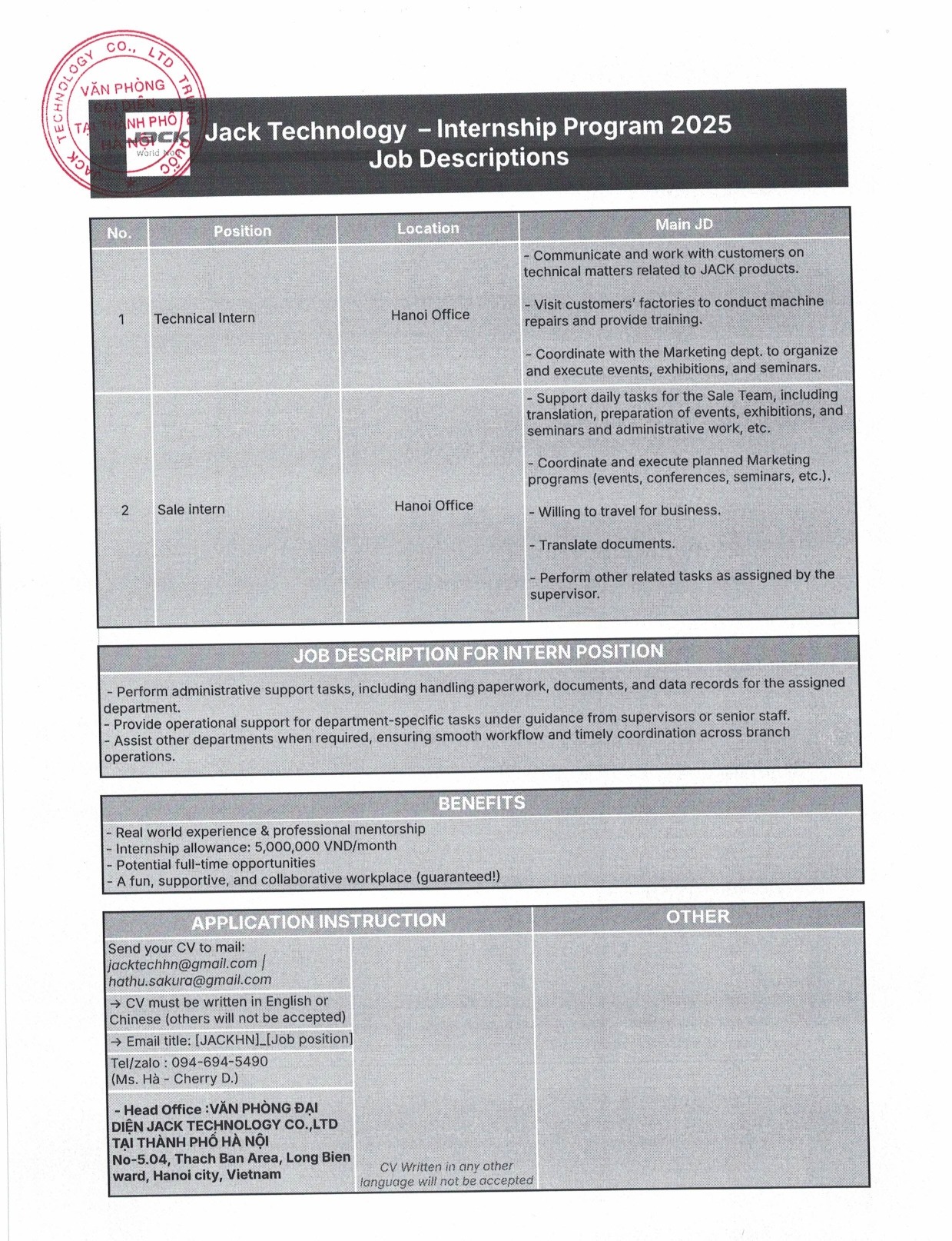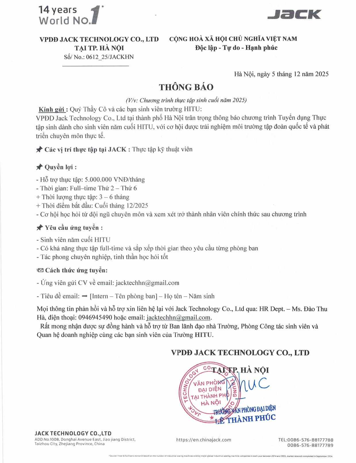 VPĐD JACK TECHNOLOGY CO., LTD tại TP. Hà Nội đang tìm kiếm các bạn sinh viên năm cuối HITU tài năng, nhiệt huyết cho Chương trình Thực tập cuối năm 2025. Đây là cơ hội vàng để trải nghiệm môi trường làm việc quốc tế và phát triển chuyên môn!