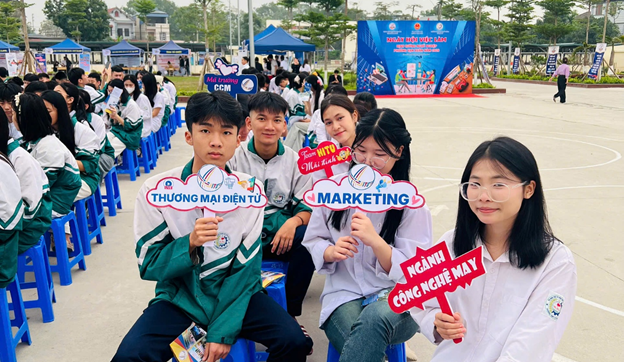 Ảnh 4: Học sinh tham gia chương trình trong không khí sôi nổi, tích cực tìm hiểu các ngành học Thương mại điện tử, Marketing và Công nghệ may.