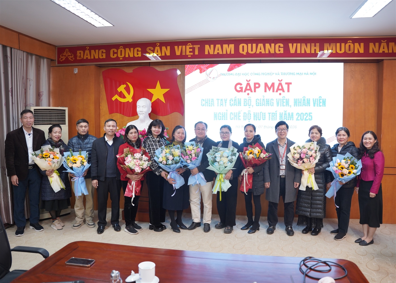 Ngày 07/01/2026, Trường Đại học Công nghiệp và Thương mại Hà Nội đã tổ chức buổi gặp mặt, chia tay 10 cán bộ, giảng viên, nhân viên nghỉ chế độ hưu trí trong năm 2025 theo quy định của Nhà nước. Buổi gặp mặt diễn ra trong không khí trang trọng, ấm áp và xúc động, là dịp để Nhà trường bày tỏ sự trân trọng, tri ân sâu sắc đối với những đóng góp bền bỉ của các thế hệ cán bộ đối với sự nghiệp xây dựng và phát triển Nhà trường.