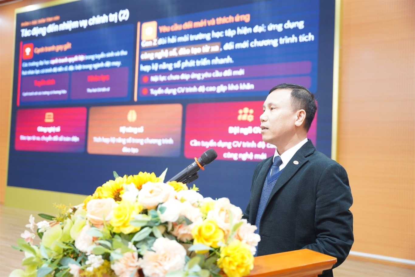 Đồng chí cũng nhấn mạnh mục tiêu đưa trí tuệ nhân tạo (AI) vào chương trình đào tạo từ năm 2026, coi đây là yêu cầu tất yếu nhằm nâng cao chất lượng đào tạo, bắt kịp xu thế chuyển đổi số trong giáo dục. Cùng với đó là nhiệm vụ nâng cao chỉ số hài lòng của người học, lấy người học làm trung tâm, thước đo cho hiệu quả hoạt động của Nhà trường.