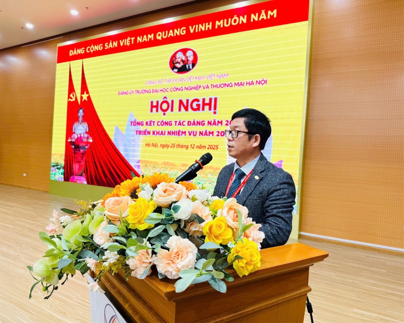 Sáng ngày 25/12/2025, Đảng bộ Trường Đại học Công nghiệp và Thương mại Hà Nội đã long trọng tổ chức Hội nghị tổng kết công tác Đảng năm 2025, triển khai nhiệm vụ năm 2026. Hội nghị là dịp quan trọng nhằm nhìn lại chặng đường đã qua, đánh giá toàn diện kết quả lãnh đạo, chỉ đạo của Đảng bộ nhà trường trong năm 2025, đồng thời xác định rõ phương hướng, nhiệm vụ, giải pháp trọng tâm cho năm 2026.