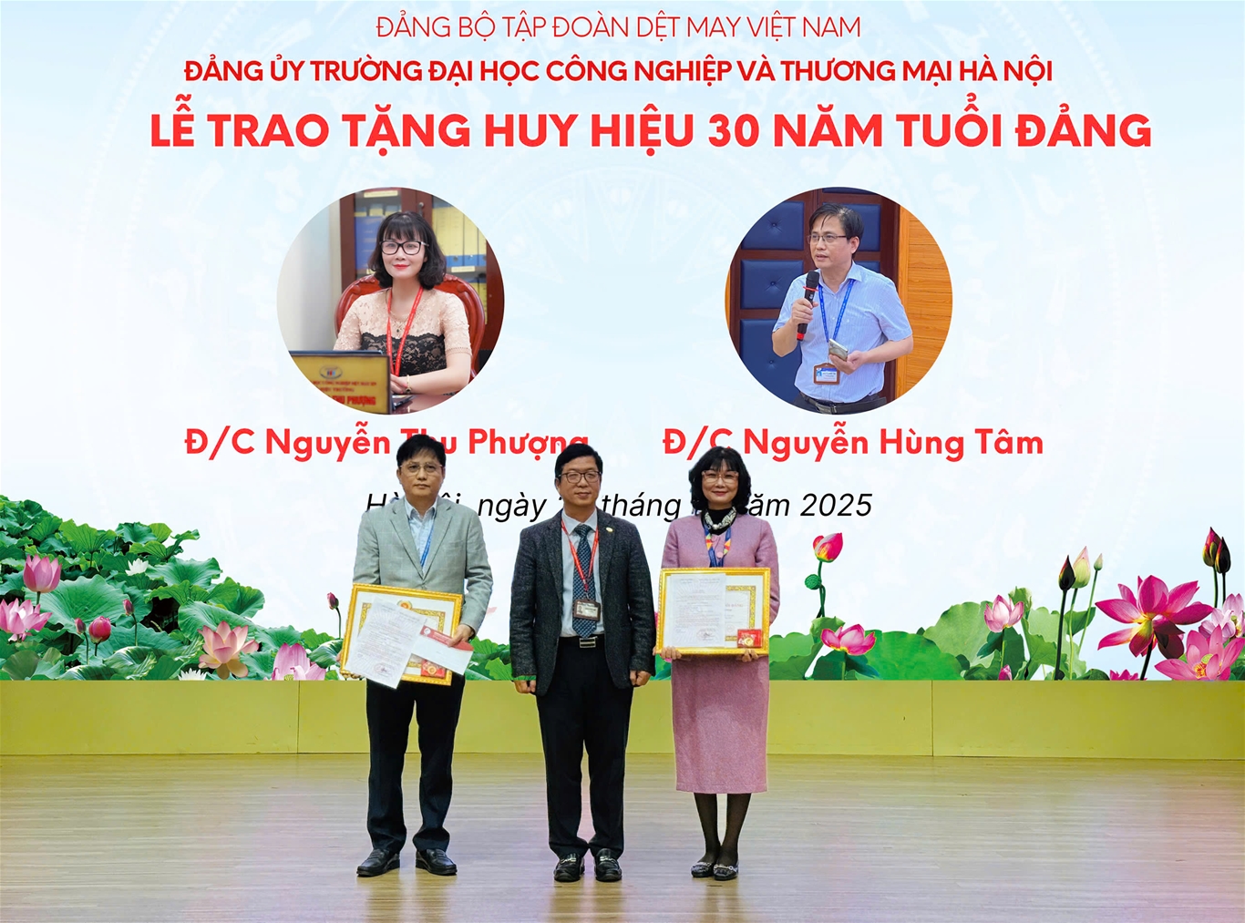 TS. Hoàng Xuân Hiệp – Bí thư Đảng ủy, Hiệu trưởng trao tặng huy hiệu 30 năm tuổi Đảng cho đ/c Nguyễn Thu Phượng và đ/c Nguyễn Hùng Tâm.