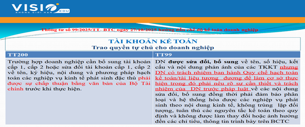 Thông tư 99/2025/TT-BTC đã làm rõ hơn quyền tự chủ của doanh nghiệp: Bỏ cơ chế “xin phép Bộ Tài chính”, chuyển sang trao quyền tự chủ cho doanh nghiệp trong việc mở, sửa, bổ sung hệ thống tài khoản kế toán. Bên cạnh đó, yêu cầu doanh nghiệp ban hành Quy chế mở tài khoản và chịu trách nhiệm trước pháp luật. Đồng thời, giữ nguyên tính thống nhất của báo cáo tài chính, không cho phép thay đổi ảnh hưởng đến chỉ tiêu báo cáo. Giảng viên cần phân tích cơ sở lý thuyết của việc "trao quyền tự chủ" này, liên hệ với nguyên tắc trọng yếu và yêu cầu về tính phù hợp của thông tin kế toán theo Luật Kế toán 2015.