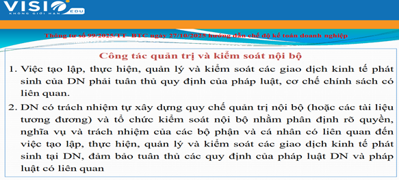Bổ sung nội dung công tác quản trị và kiểm soát nội bộ trong kế toán doanh nghiệp. Việc tạo lập, thực hiện, quản lý và kiểm soát các giao dịch kinh tế phát sinh của doanh nghiệp phải tuân thủ quy định của pháp luật, cơ chế chính sách có liên quan. Doanh nghiệp có trách nhiệm tự xây dựng quy chế quản trị nội và tổ chức kiểm soát nội bộ nhằm phân định rõ quyền, nghĩa vụ và trách nhiệm của các bộ phận và cá nhân có liên quan đến việc tạo lập, thực hiện, quản lý và kiểm soát các giao dịch kinh tế phát sinh tại doanh nghiệp, đảm bảo tuân thủ các quy định của pháp luật doanh nghiệp và pháp luật có liên quan.