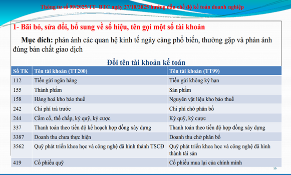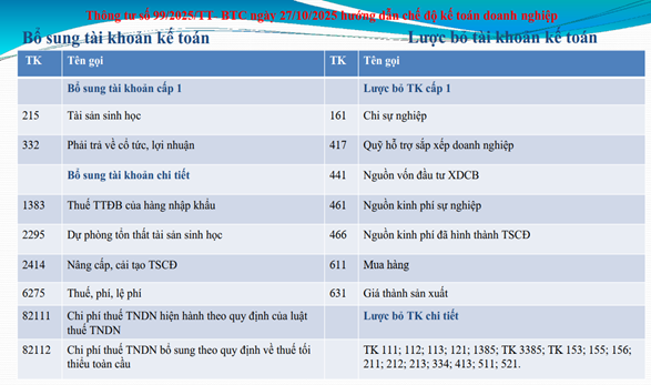 Đổi tên, bổ sung một số tài khoản kế toán, đồng thời loại bỏ một số tài khoản kế toán khỏi danh mục hệ thống tài khoản kế toán. Ví dụ Tài khoản 155 “Thành phẩm” được đổi tên thành Tài khoản 155 “Sản phẩm”. Bổ sung Tài khoản 215 “ Tài sản Sinh học”