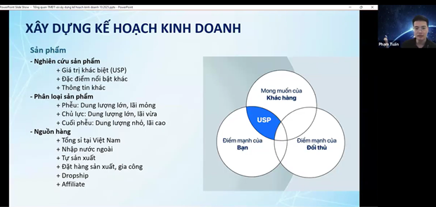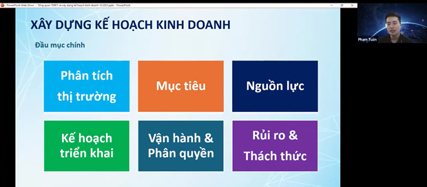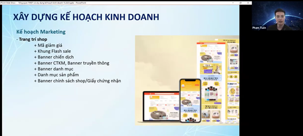 Trong buổi tập huấn, chuyên gia Phạm Ngọc Tuấn đã đi sâu hướng dẫn sinh viên từng bước cụ thể trong quy trình lập kế hoạch kinh doanh online trên sàn TMDTD– một nội dung trọng tâm, giúp các đội thi hiểu rõ cách thức biến ý tưởng kinh doanh thành kế hoạch khả thi và hiệu quả. Quá trình này bắt đầu từ phân tích thị trường và hành vi khách hàng, trong đó sinh viên học cách xác định nhu cầu, xu hướng tiêu dùng và đối thủ cạnh tranh trên các sàn thương mại điện tử. Tiếp theo là bước lựa chọn sản phẩm kinh doanh, đảm bảo sản phẩm có lợi thế cạnh tranh, phù hợp với thị hiếu khách hàng mục tiêu và xu hướng tiêu dùng hiện hành.