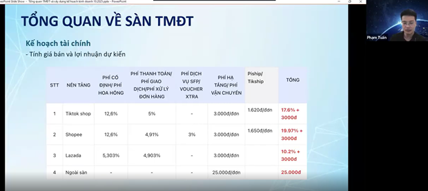 Sau đó, chuyên gia hướng dẫn cách sử dụng các công cụ khuyến mãi như mã giảm giá Follower, mã thường, mã riêng tư; Flash sale shop tự tạo, giá sale tự tạo; Mua kèm/tặng kèm và lựa chọn kênh quảng bá phù hợp như Facebook, TikTok, Shopee Live hay LazLive. Bước tiếp theo là dự toán chi phí và kế hoạch tài chính, trong đó sinh viên học cách tính toán ngân sách cho quảng cáo, nhân sự, vận chuyển, tồn kho và chi phí nền tảng, đồng thời xác định điểm hòa vốn và biên lợi nhuận dự kiến.
