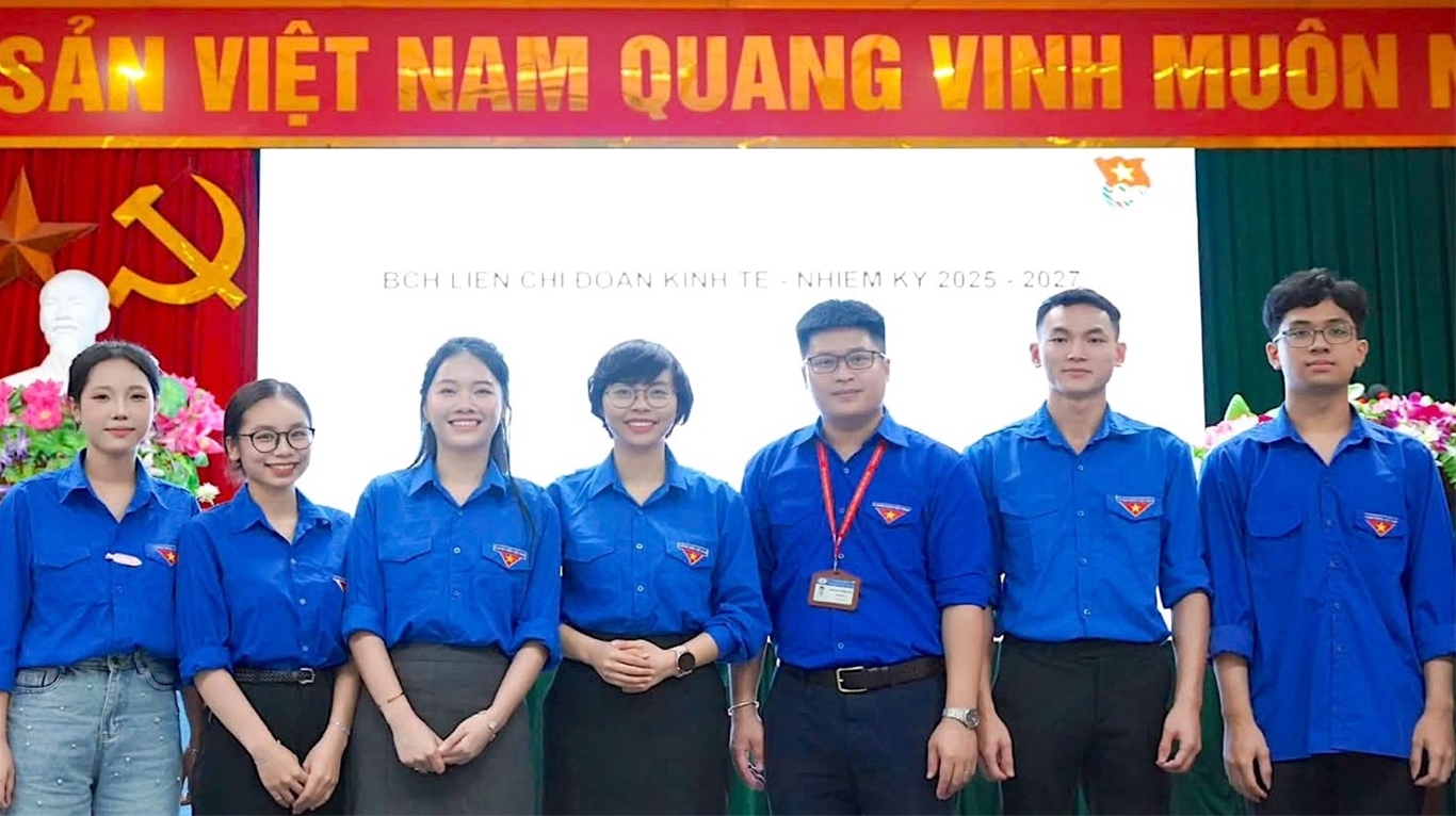 Nguyễn Đức Nghĩa (ngoài cùng bên phải) chụp ảnh cùng BCH LCĐ khoa Kinh tế