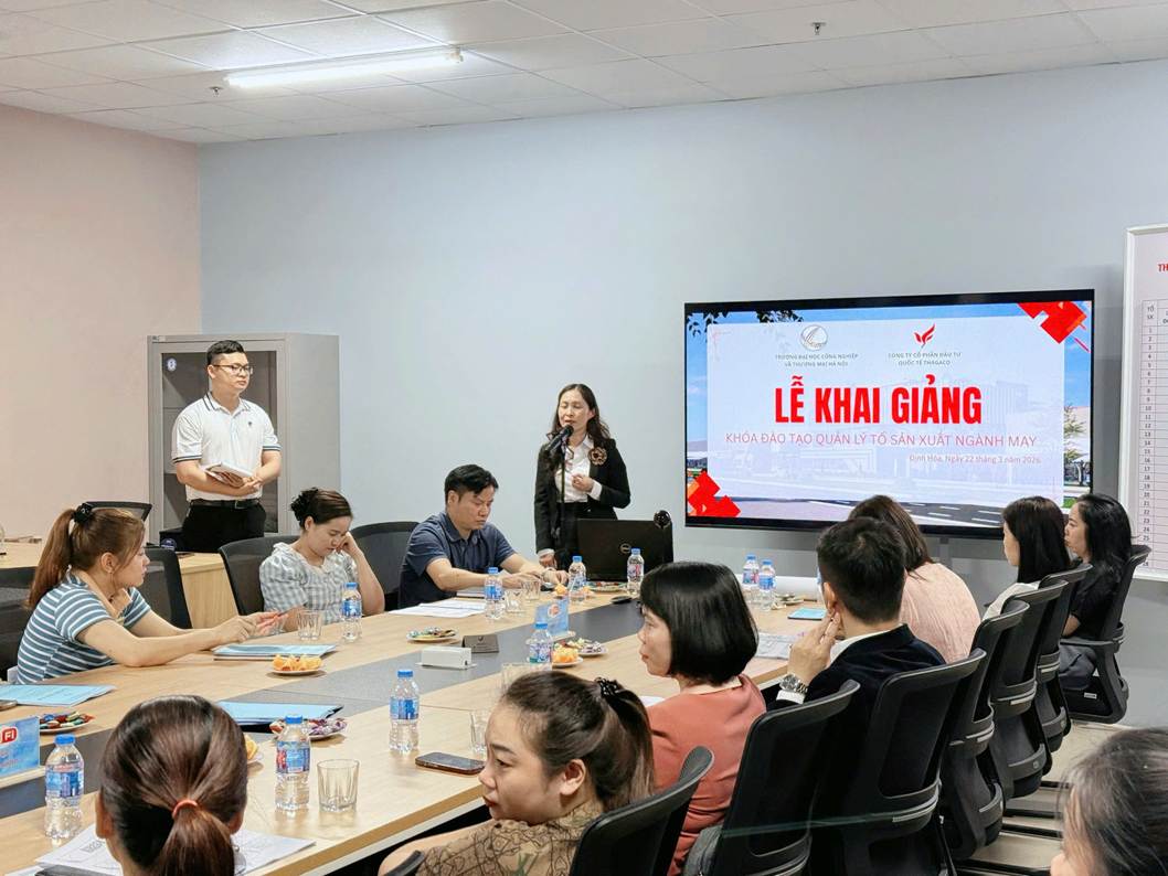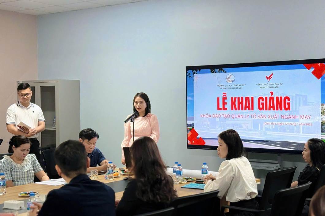 Sáng ngày 22/3/2026, tại Thái Nguyên, Trường Đại học Công nghiệp và Thương mại Hà Nội phối hợp cùng Công ty Cổ phần Đầu tư Quốc tế Thagaco long trọng tổ chức khai giảng khóa đào tạo “Quản lý tổ sản xuất ngành may” theo chương trình đặt hàng của Công ty.