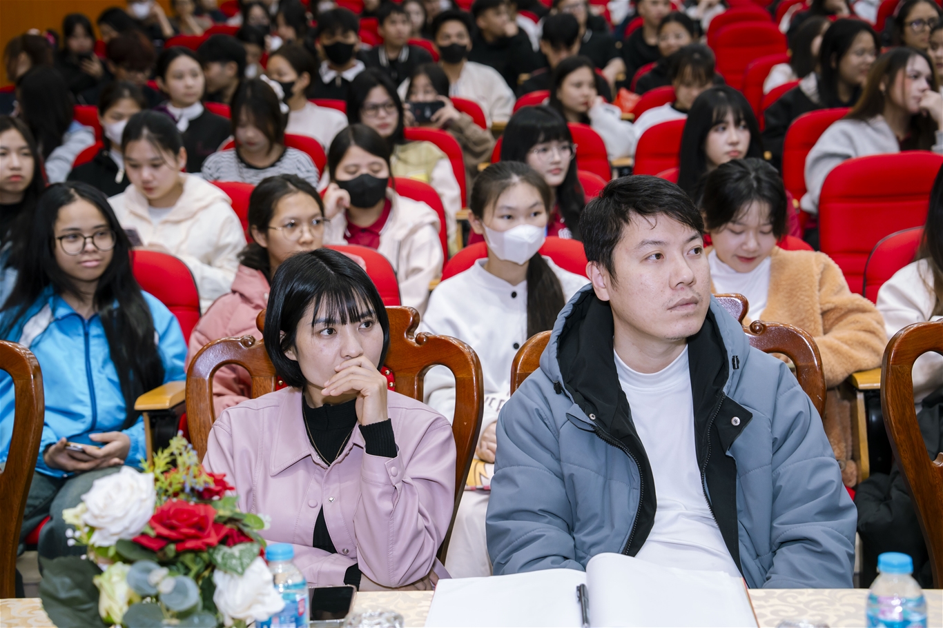 Phần giao lưu, hỏi đáp diễn ra sôi nổi với nhiều câu hỏi thiết thực từ sinh viên các ngành như Marketing, Kinh doanh thương mại và sinh viên năm nhất, tập trung vào việc ứng dụng AI trong nghiên cứu khách hàng, xây dựng nội dung, tối ưu quảng cáo, bán hàng trên các sàn thương mại điện tử, cũng như lộ trình bắt đầu học và sử dụng các công cụ AI phù hợp.