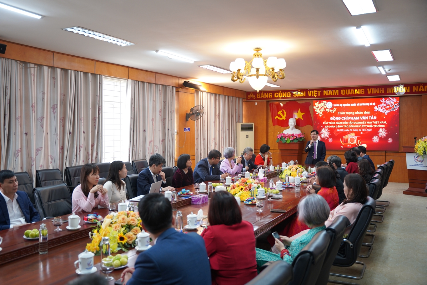 Trong không khí đầm ấm, phấn khởi của những ngày đầu xuân, ông Phạm Văn Tân chúc mừng Nhà trường đã đạt nhiều thành tích nổi bật trong năm qua, đặc biệt trong công tác đào tạo nguồn nhân lực chất lượng cho ngành dệt may. Đại diện doanh nghiệp sử dụng lao động do Nhà trường đào tạo, ông nhấn mạnh năm 2025 là năm Vinatex đạt kết quả cao nhất trong 30 năm hoạt động. Theo ông, máy móc có thể đầu tư, tài chính có thể huy động, nhưng nguồn nhân lực có kỹ năng, tay nghề và tư duy mới là yếu tố quyết định sự phát triển bền vững, bởi “con người có thể thay đổi mọi thứ”.