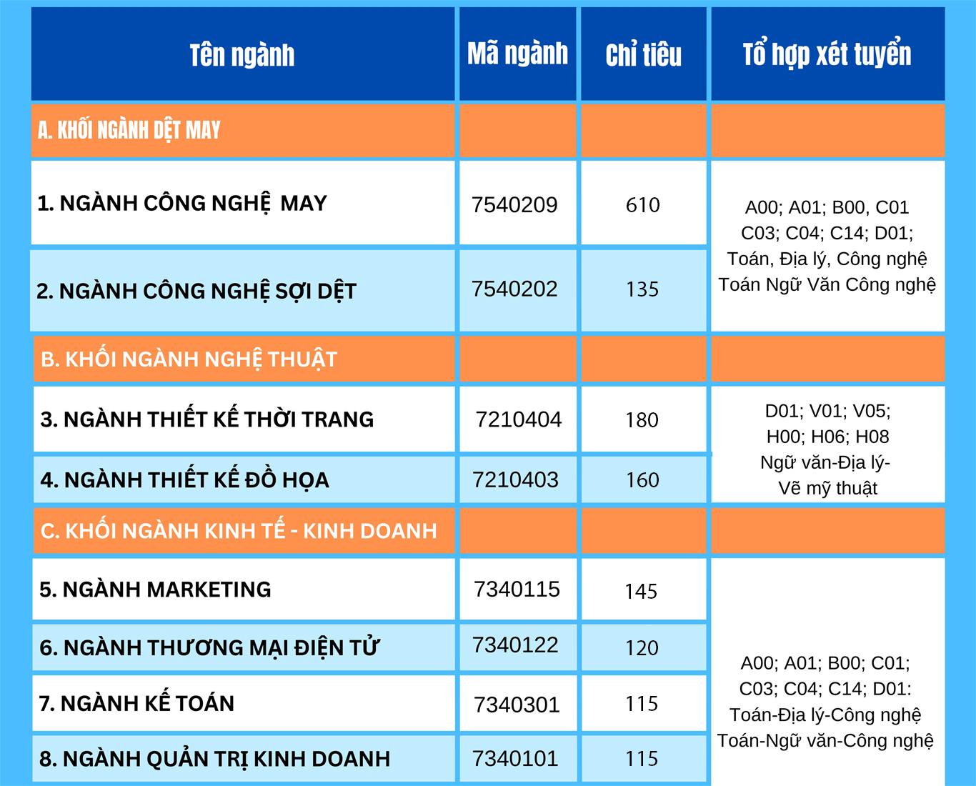 Chú ý: Đối với ngành Thiết kế thời trang, Thiết kế đồ họa, nếu thí sinh đăng ký tổ hợp có môn năng khiếu thì có thể thi tuyển năng khiếu tại trường Đại học Công nghiệp Dệt May Hà Nội hoặc chuyển điểm từ các trường Đại học có tổ chức thi năng khiếu năm 2025.