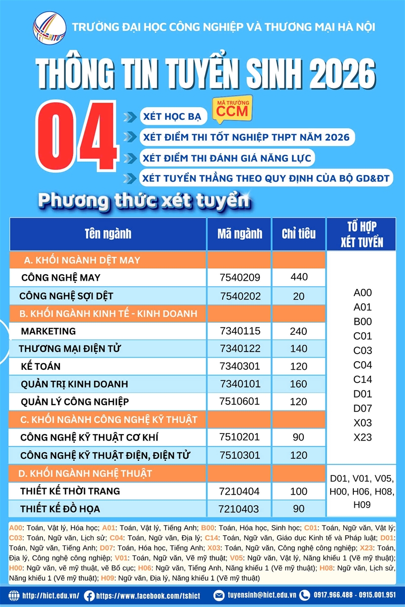 Thí sinh có thể sử dụng kết quả thi năng khiếu môn Vẽ Mỹ thuật, Bố cục màu tại trường Đại học Công nghiệp và Thương mại Hà Nội (thi tuyển vào 10/5/2026) hoặc chuyển kết quả thi năng khiếu khối V và khối H của các trường đại học khác có tổ chức thi trong năm 2026 để xét tuyển.