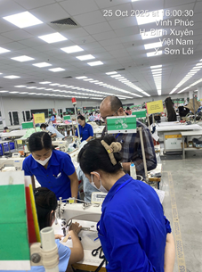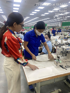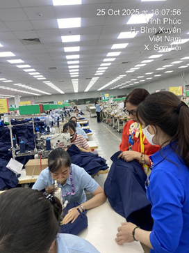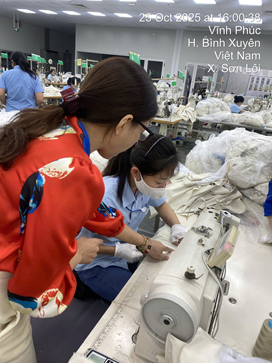 Trong ngành may mặc, năng suất, chất lượng là yếu tố quan trọng của một doanh nghiệp. Việc kiểm soát chất lượng được thực hiện từ khâu nguyên phụ liệu cho đến khâu cuối cùng hoàn thành sản phẩm. Tuy nhiên, trong thực tế quá trình triển khai mã hàng tại dây chuyền sản xuất tại doanh nghiệp vẫn còn xảy ra các lỗi kỹ thuật, lỗi lắp ráp trên sản phẩm mà khách hàng không chấp nhận. Do vậy, để đảm bảo chất lượng buổi học cũng như giảng dạy gắn liền với thực tế. Tháng 10/2025 Ths Đặng Thị Đan – giảng viên Trung tâm thực hành may hướng dẫn học viên xử lý trực tiếp trên dây chuyền may một số lỗi phát sinh mã 70503 như: Cửa quần căng, giật, dọc quần cong gẫy…Giảng viên phân tích giảng giải, học viên vận dụng và tìm ra nguyên nhân xử lý các lỗi trên. Ngoài ra, Giảng viên hướng dẫn học viên là cán bộ tại phòng kỹ thuật bổ sung điểm bấm dấu tại đũng sau mã 70503 giúp hạn chế được lỗi túi sau không đối xứng.