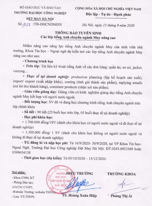 Thông báo tuyển sinh các lớp tiếng Anh chuyên ngành May nâng cao