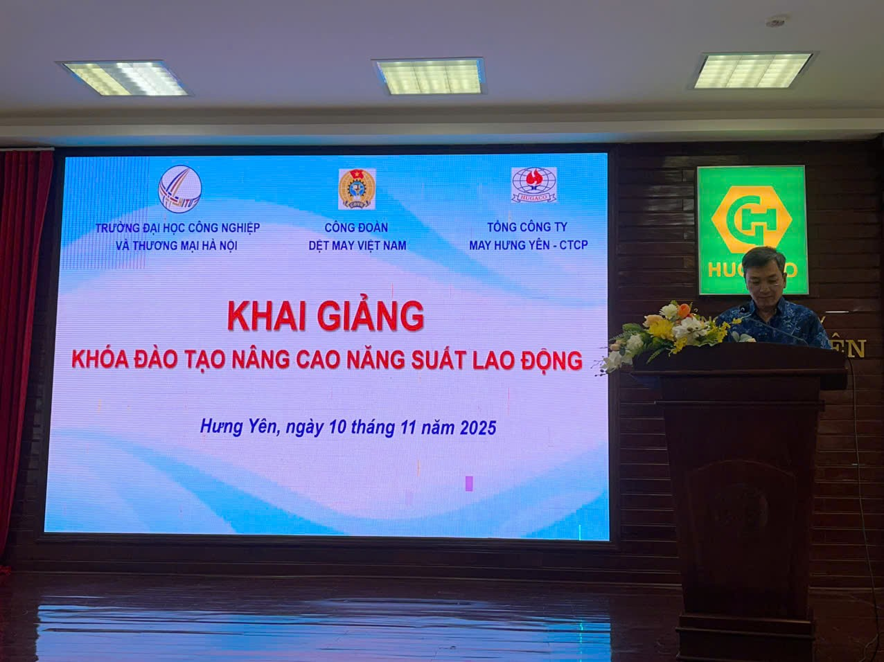 Nằm trong chuỗi các khóa đào tạo trong năm 2025 theo thỏa thuận hợp tác giữa trường Đại học Công nghiệp và Thương mại Hà Nội và Công đoàn Dệt may Việt Nam, sáng ngày 10/11/2025, tại Hưng Yên, Tổng Công ty cổ phần Hưng Yên - CTCP đã phối hợp với trường Đại học Công nghiệp và Thương mại Hà Nội tổ chức đào tạo 02 lớp Bồi dưỡng “Nâng cao năng suất lao động”