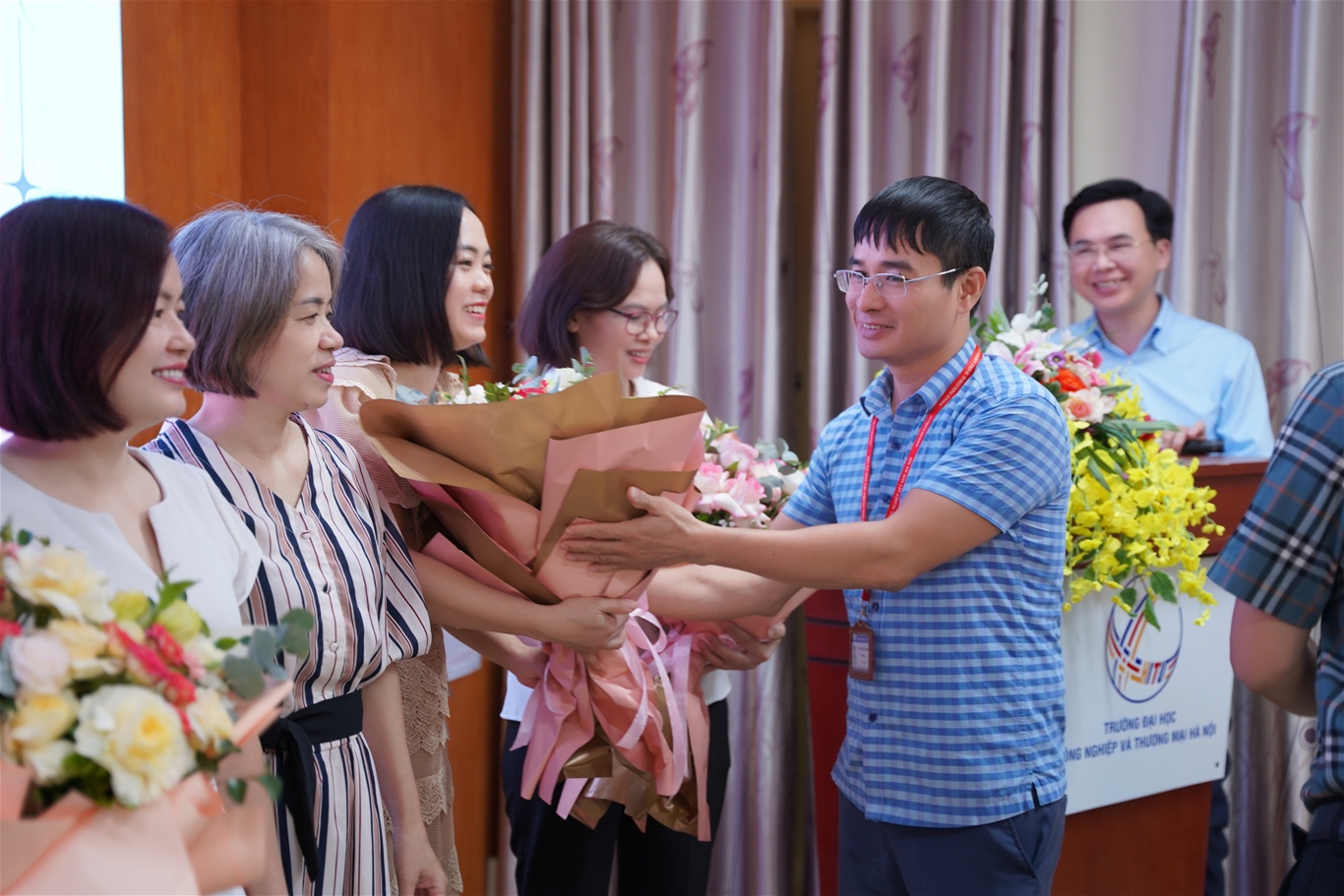 Buổi lễ diễn ra trong không khí thân mật, vui tươi với những lời chúc, bó hoa tươi thể hiện tinh thần đoàn kết, gắn bó của tập thể HITU.