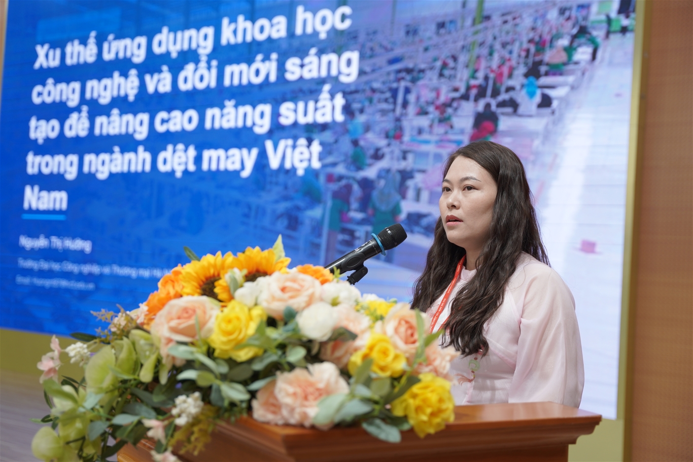 Hội thảo cũng ghi nhận các báo cáo về ứng dụng trí tuệ nhân tạo (AI) trong đổi mới quản trị nhân lực tại doanh nghiệp dệt may nhằm nâng cao năng suất và ứng dụng trí tuệ nhân tạo (AI) để đổi mới quy trình bán hàng tại doanh nghiệp kinh doanh sản phẩm dệt may nhằm nâng cao năng suất do TS. Dương Thị Tân và Th.s Đinh Thị Thủy trình bày. Các nghiên cứu cho thấy hiệu quả rõ rệt của AI trong bối cảnh doanh nghiệp thiếu nhân lực, yêu cầu cao về tốc độ và chất lượng công việc.
